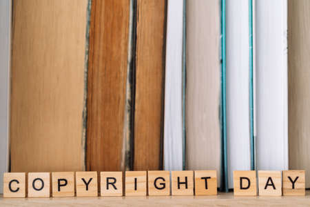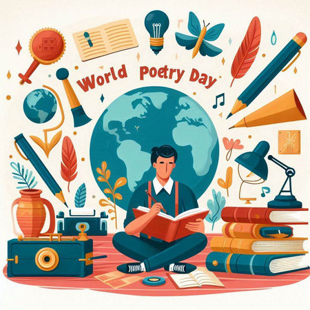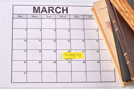 Flat lay top view world poetry day concept. Calendar and stack of old books.