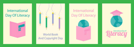 set of four colorful postcards for international literacy day with books and globe. isolated vector
