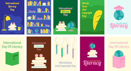 international literacy day with books, feather pen, pencil and globe. colorful isolated postcards on white background