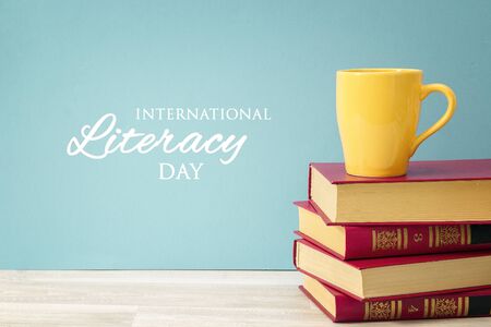 International Literacy Day poster with stack of books on note paper background. Education concept.