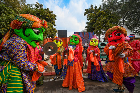NEW DELHI INDIA FEBRUARY 20 2025 Artists wearing masks seen performing during the swearing in ceremony of Chief Minister of Delhi Rekha Gupta and cabinet ministers at Ramlila Maidan on February 20 2025 in New Delhi India Photo by Sanchit Khanna Hindustan