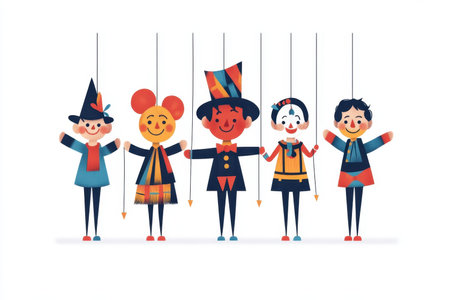 Five whimsical puppets are arranged in a vibrant display, each wearing unique costumes that reflect a carnival theme. The playful characters include a magician, a clown, and a cheerful mouse, all highlighting joyous festivities.