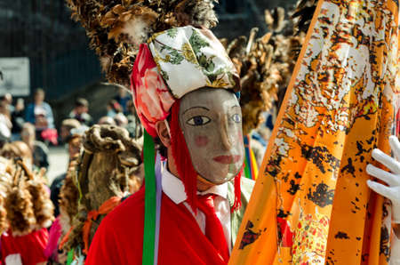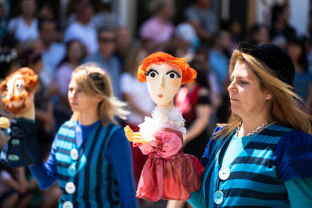 Kazanlak, Bulgaria - June 6, 2021: Women holding puppets during the annual Kazanlak Rose Festival parade when folklore groups local artists music bands and students show their creative abilities during a march through the center of the city
