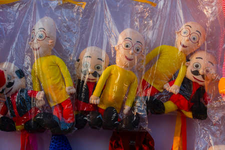 Colorful dolls, handicraft products being sold at hastashilpomela or handicrafts fair at Kolkata, West Bengal, India