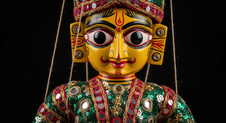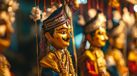 Vibrant wooden puppets of an ancient Indian puppet theater, depicting mythological stories and legends