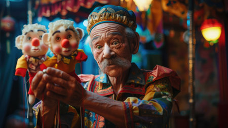The picture of the puppeteer is selling marionette at the shop with colourful light background, the puppeteer require skill like audience engagement, creativity, puppetry expertise, experience. AIG43.