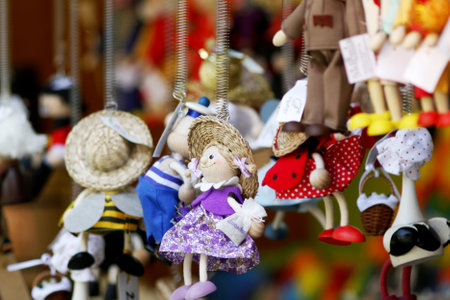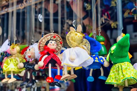 Handmade dolls in the form of figures at the Christmas market at the town hall of the city in Europe close-up. High quality photo