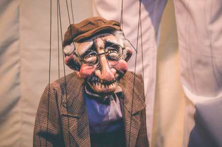 Puppets strung on wires depicting detailed figures engaged in scripted dialogues, featured against an abstract backdrop with a clear left area.