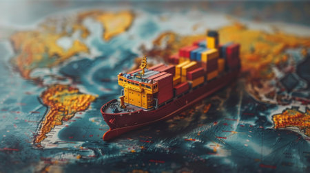 A container ship filled with red and blue boxes rests on a vibrant map. The background appears semi-transparent, enhancing the global trade theme and emphasizing connection.