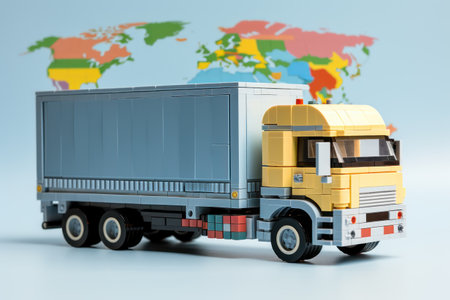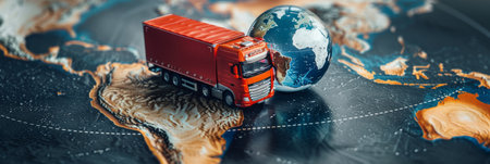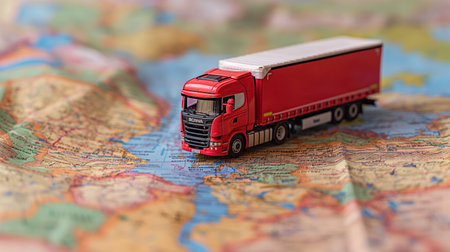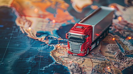 Red Toy Semi-Truck on World Map, Symbolizing Global Logistics, Shipping, and Supply Chain Management