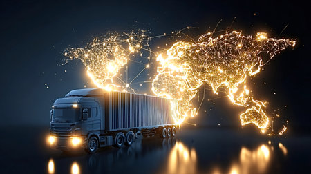 Illustration of a truck on a world map, symbolizing global logistics and trade. The image showcases connection lines representing international shipping and transport networks.