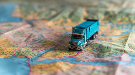 A toy truck is seen sitting on top of a road map, illustrating a miniature scene of transportation and exploration.