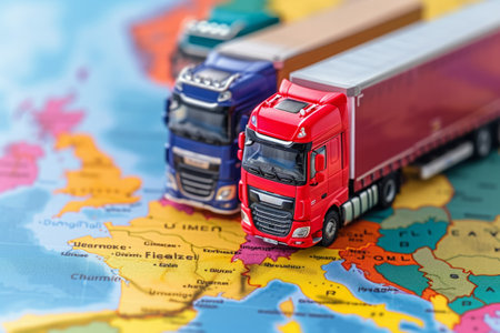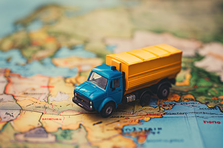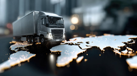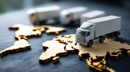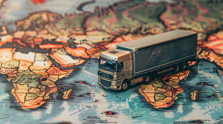 Truck model transporting goods across international borders, set against a world map, with a focus on the concept of cross border transportation and trade.
