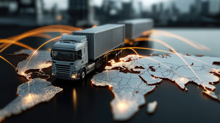 A visually captivating representation of a digital transport network featuring truck models on an abstract map. This image illustrates the connectivity in logistics and transportation.