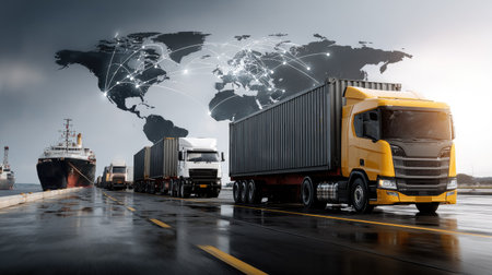 A dramatic scene of trucks transporting goods alongside container ships, featuring a world map backdrop, illustrating the interconnectedness of global logistics.