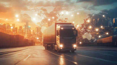 A truck navigating city streets at sunset, symbolizing global logistics and the interconnected world. Ideal for themes of transportation and commerce.