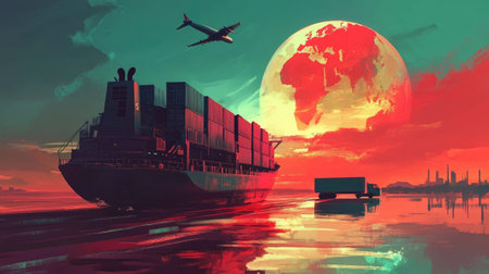 A stunning illustration featuring a cargo ship against a vibrant sunset with an airplane flying overhead, highlighting themes of global trade, transportation, and industry.