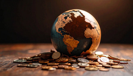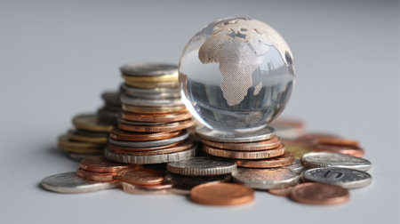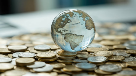 A glass globe sits prominently atop a collection of coins, illustrating the interconnectedness of global finance and the flow of currency in modern economies.