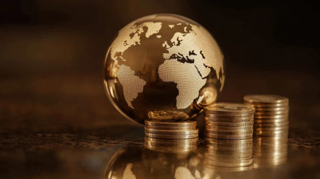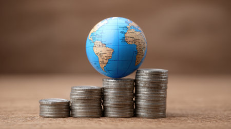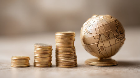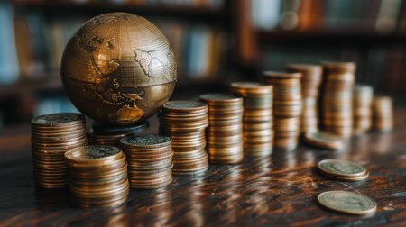 A golden globe depicting the world rests next to stacked coins, illustrating themes of wealth, investment, and the global economy, perfect for finance-related content.
