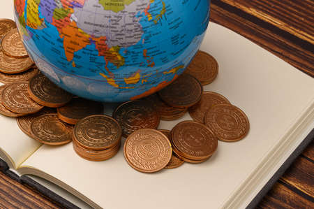 Globe and coins on dark background. Global business and finance concept.