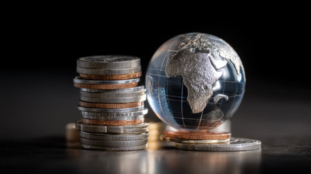 Globe made of glass sits beside stack of coins, symbolizing global finance and investment. shiny surface of globe reflects light, creating intriguing visual contrast with metallic coins