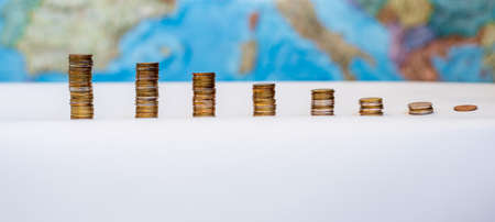 Global trade and financial concept - decreasing stack of coin in front of earth globe