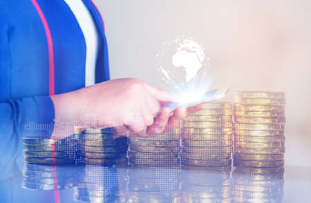 Coins Stack, calculator, virtual hologram world map. Concept of money saving, financial. Savings money,income Investment ideas, management