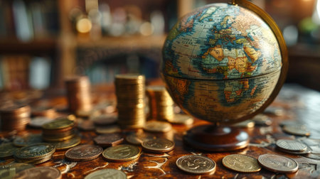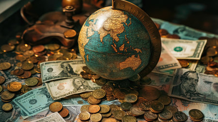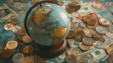 A detailed globe surrounded by coins and banknotes, symbolizing global finance and wealth. The composition evokes themes of exploration and economy.