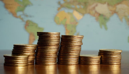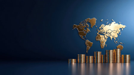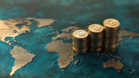 A series of gold coin stacks of varying heights are neatly arranged on a reflective surface. Behind them, a map is displayed, showing continents and oceans. The conveys a sense of global finance, international trade, and the accumulation of wealth. The lighting is soft, highlighting the golden hue of the coins and the details of the map.
