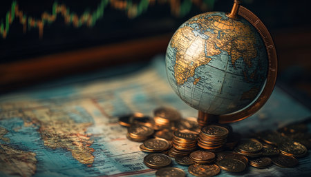 This image captures a globe placed on a stack of coins, with financial charts in the background, symbolizing the interconnected nature of global finance and investment strategies.