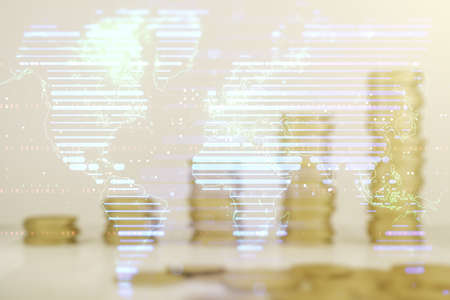 Multi exposure of abstract creative digital world map hologram on growing stacks of coins background, research and analytics concept