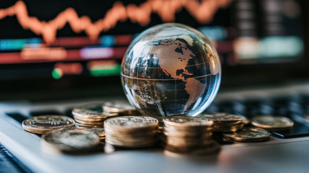A detailed globe rests on a stack of coins, symbolizing finance and global economy. The background features a financial chart, representing market trends.