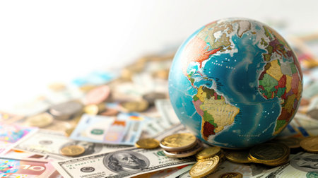 A close-up view of a globe surrounded by various currencies, symbolizing global finance and economic exchange, ideal for themes of investment and wealth.