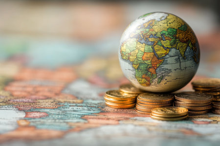 A detailed globe rests on a stack of golden coins, symbolizing the relationship between geography and finance in a modern business environment.
