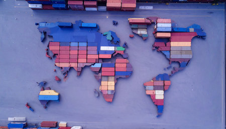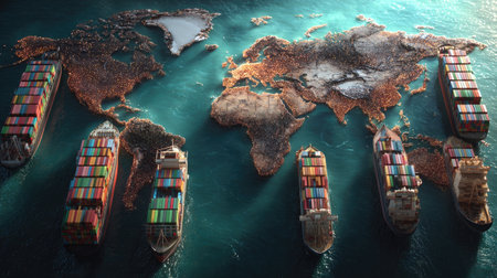 A captivating visualization of global trade, featuring a world map adorned with shipping containers and cargo ships, highlighting the connectivity of international logistics.