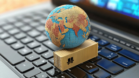 Small, detailed model of a globe, positioned atop a miniature shipping container. The container is situated on a laptop keyboard.