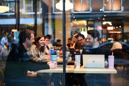 A lively interior shot of a contemporary coffee shop filled with diverse individuals engaged in work and conversation. Laptops, coffee cups, and natural light from large windows create a productive and social atmosphere.
