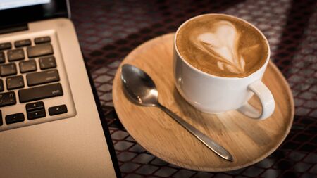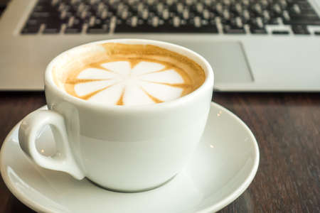 Hot art Latte Coffee in a cup and laptop on wooden table.
