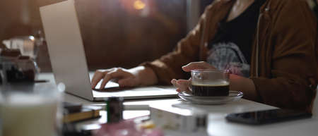 Woman hand holding a cup of latte coffee and using digital laptop reading newsletter white mock-up copy space,working on table in the morning