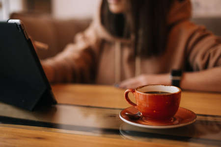 Close-up of a cup of dark coffee on a table in a cafe. In the background sits a unrecognizable young woman in casual clothes and works at a digital tablet.