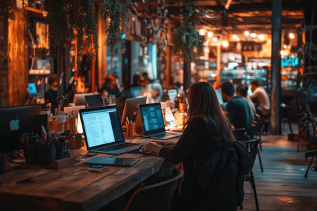 A busy cafe with people in business attire working on laptops. --ar 3:2 Job ID: c346390d-c634-4ff3-867b-80cc3a978431