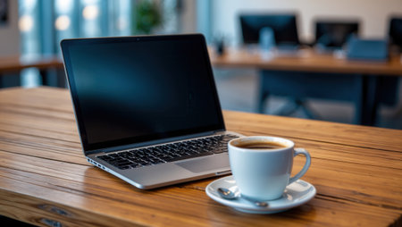 Open laptop placed on a wooden desk alongside a cup of coffee in a contemporary office setting. Blurred background with chairs and tables visible.