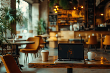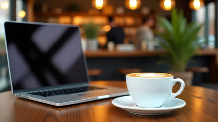 A serene workspace with a laptop and coffee cup in a cozy caf