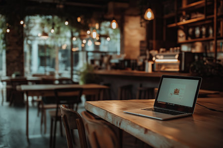 Laptop computer on wooden table in coffee shop with bokeh background