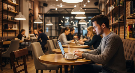 A freelancer working on a laptop at a cozy cafe with ambient lighting, symbolizing creativity, remote work, and a relaxed workspace environment.