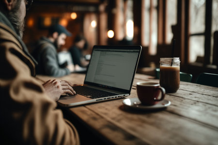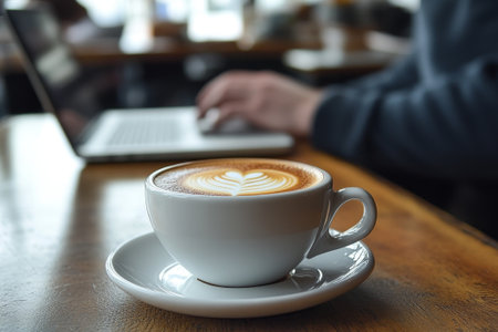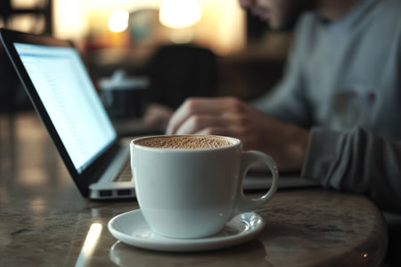 A coffee cup rests on a wooden table while a person focuses intently on their laptop, surrounded by a warm and inviting atmosphere.