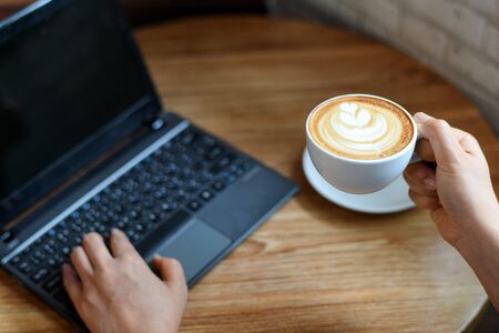 Top view of female hands holding cup of cappuccino and using laptop while sitting in cafe