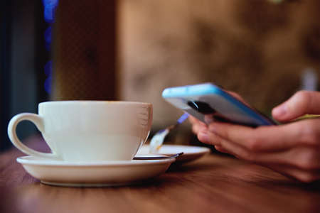 Woman hand use smartphone at cafe, surfing internet browser, have a coffee break. Online communication and social media
