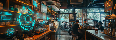 Selective focus of AR glasses view of coffee shop with programmable command buttons and text floating in the air.