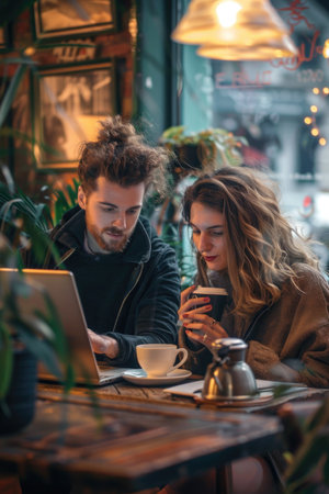 A man and a woman are sitting at a table in a cafe, looking at a laptop. The man is wearing a black shirt and the woman is wearing a brown coat. They are both holding cups of coffee